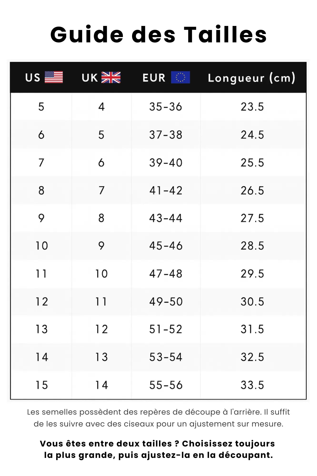 Pas d'inquiétude ! Commandez simplement notre plus petite taille : vous pourrez la découper facilement en suivant les repères situés à l’arrière des semelles pour un ajustement parfait.